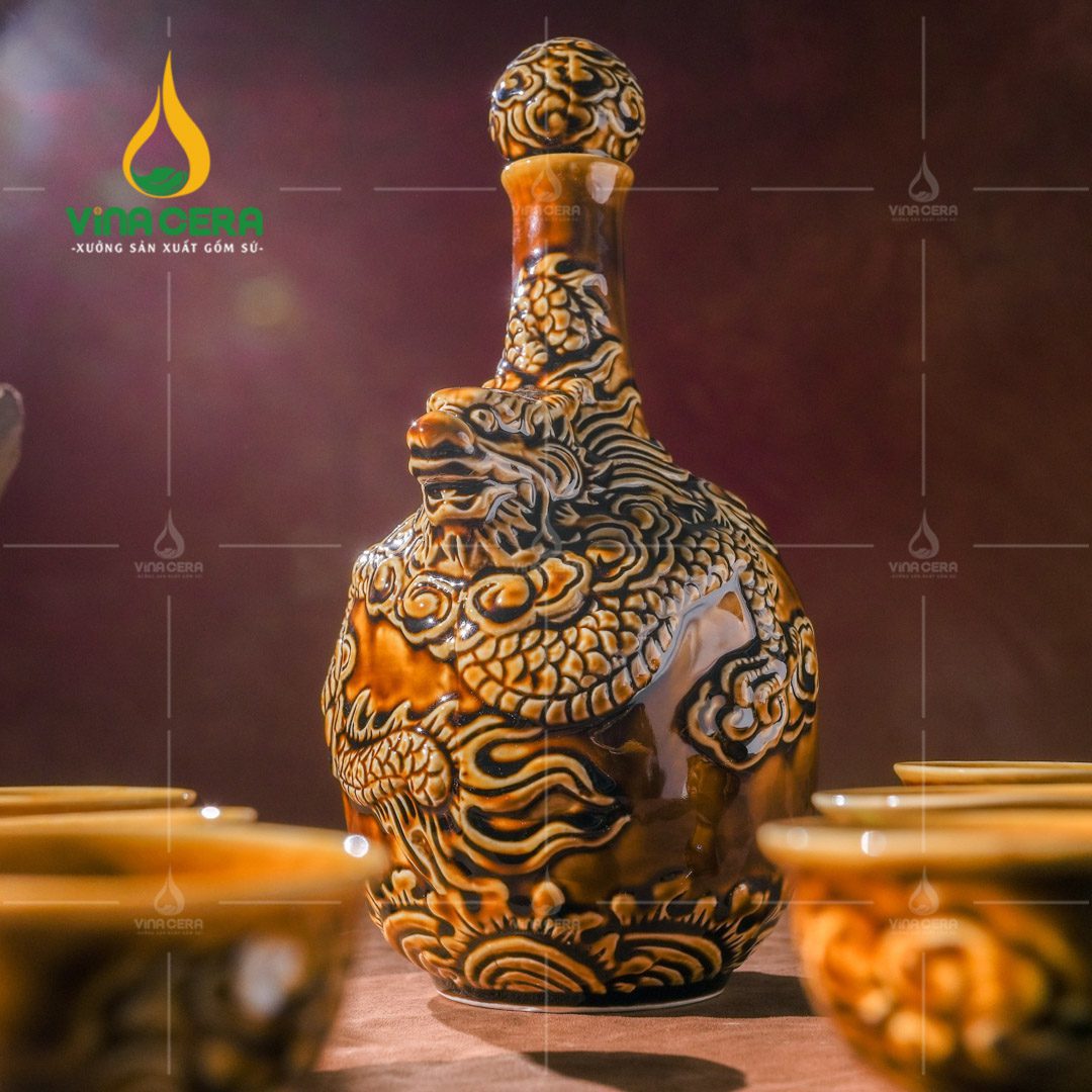 - Bình đựng rượu gốm sứ trang trí theo phong cách cổ điển, với những họa tiết hoa văn truyền thống như rồng, phượng… và màu sắc đậm nét. Những mẫu bình này thường mang đến cảm giác lịch lãm và sang trọng cho không gian sử dụng.
