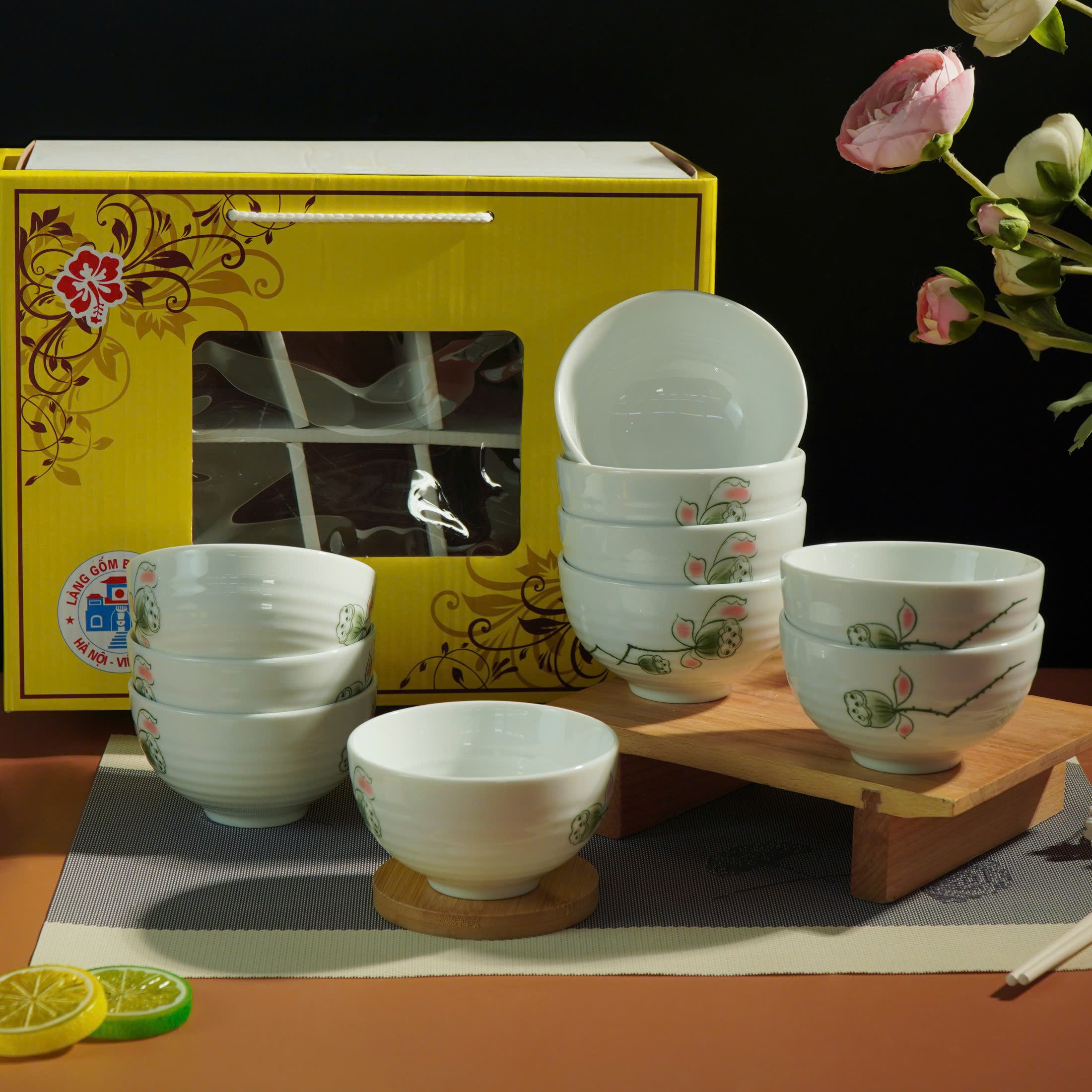 Bộ Bát Cơm Bát Tràng Men Kem Đài Sen