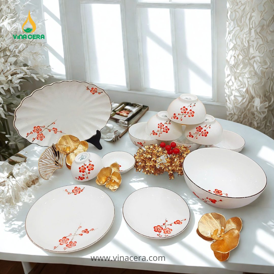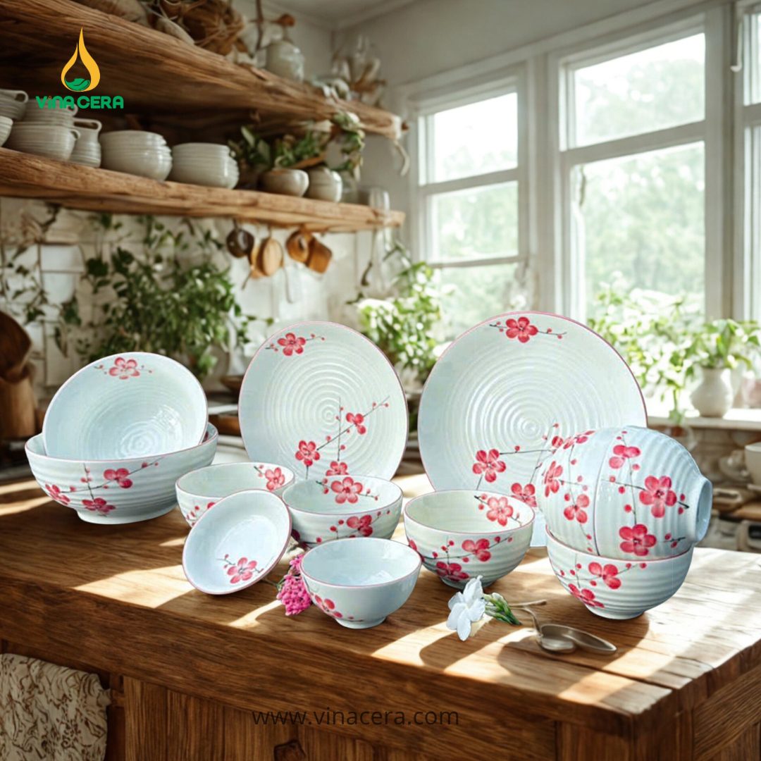 Bộ bát đĩa Bát Tràng hoa đào là một sản phẩm phổ biến trong nhiều gia đình, được yêu thích bởi thiết kế đơn giản nhưng vẫn thể hiện được sự tinh xảo và tỉ mỉ. Đây là một món quà tặng ý nghĩa và thiết thực, được sản xuất tại Xưởng Gốm Sứ Vinacera, một trong những xưởng sản xuất hàng đầu tại Bát Tràng. Bên cạnh việc sản xuất gốm sứ, Xưởng Gốm Sứ Vinacera còn cung cấp giải pháp in ấn giúp các tổ chức và doanh nghiệp tiết kiệm chi phí và thời gian khi có nhu cầu in ấn lên các sản phẩm gốm sứ.