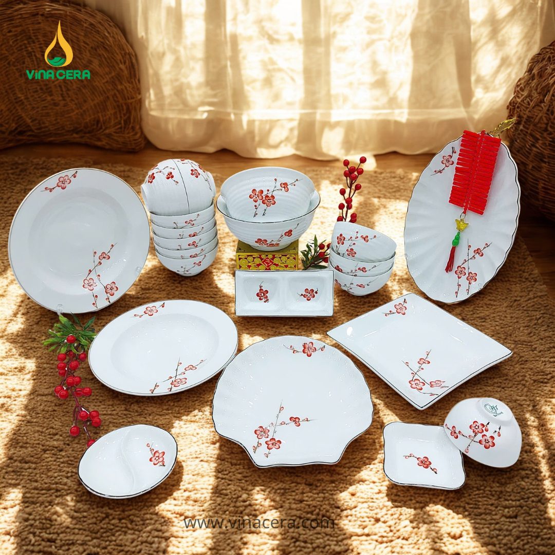 Tên Sản Phẩm: Bộ bát đĩa Bát Tràng hoa đào Xuất xứ: Bát Tràng, Việt Nam Chất liệu: Gốm sứ cao cấp Số lượng: 10 bát con, 4 tô, 5 đĩa, 1 bát chấm, 2 đĩa chấm Màu sắc: Trắng Họa tiết: Hoa đào Đóng gói: Hộp xi lót lụa Quy chuẩn kỹ thuật: Đạt tiêu chuẩn chất lượng In logo: Theo yêu cầu