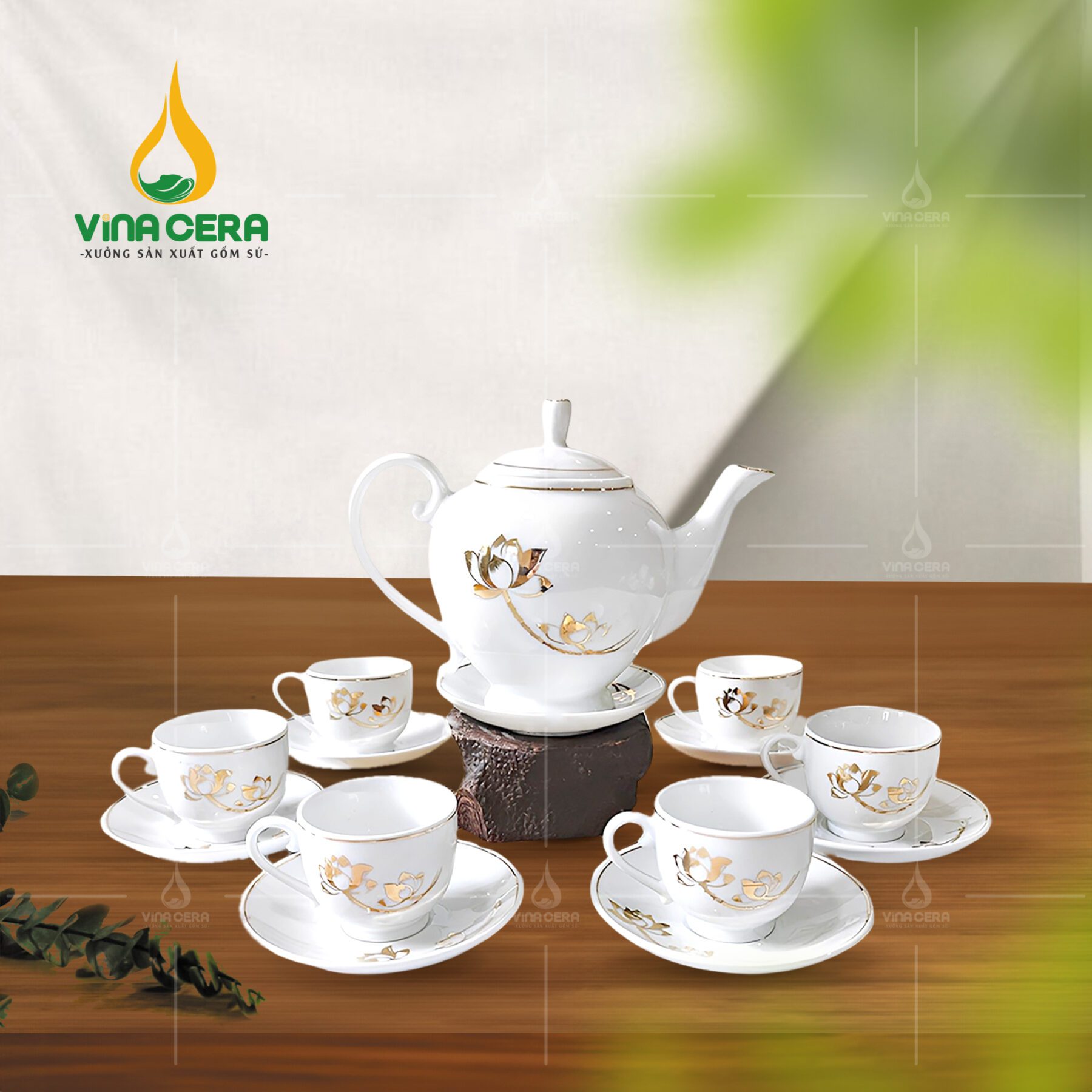 Bộ trà sứ cao cấp, in logo, họa tiết sen vàng và kẻ chỉ vàng,