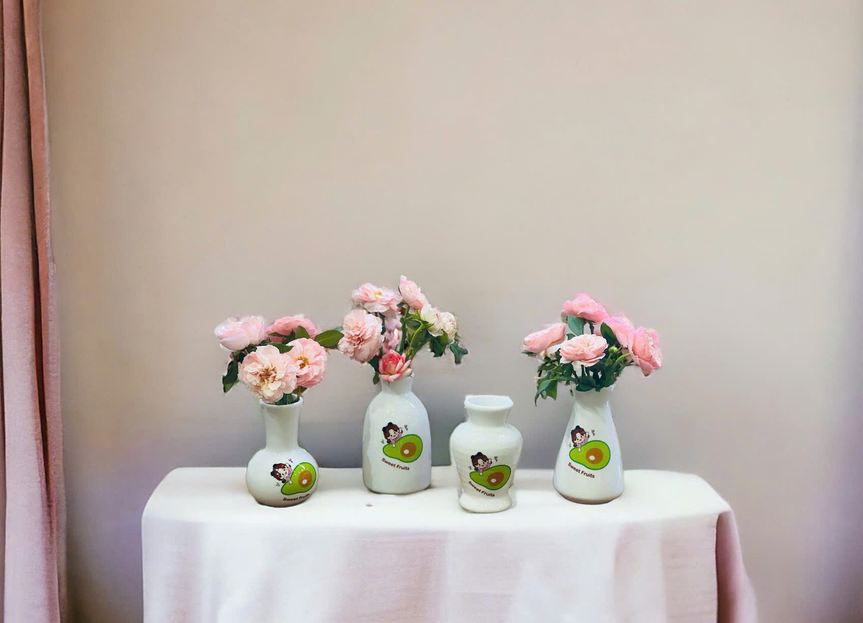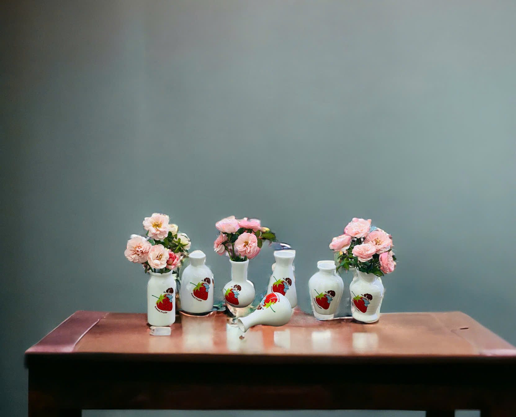 Các mẫu lọ hoa với nền trắng, được vẽ các hình ảnh như cô gái, hoa hồng, quả dâu, hoa văn trang trí,… mang phong cách trẻ trung, đáng yêu, phù hợp với nhiều lứa tuổi và môi trường làm việc khác nhau.