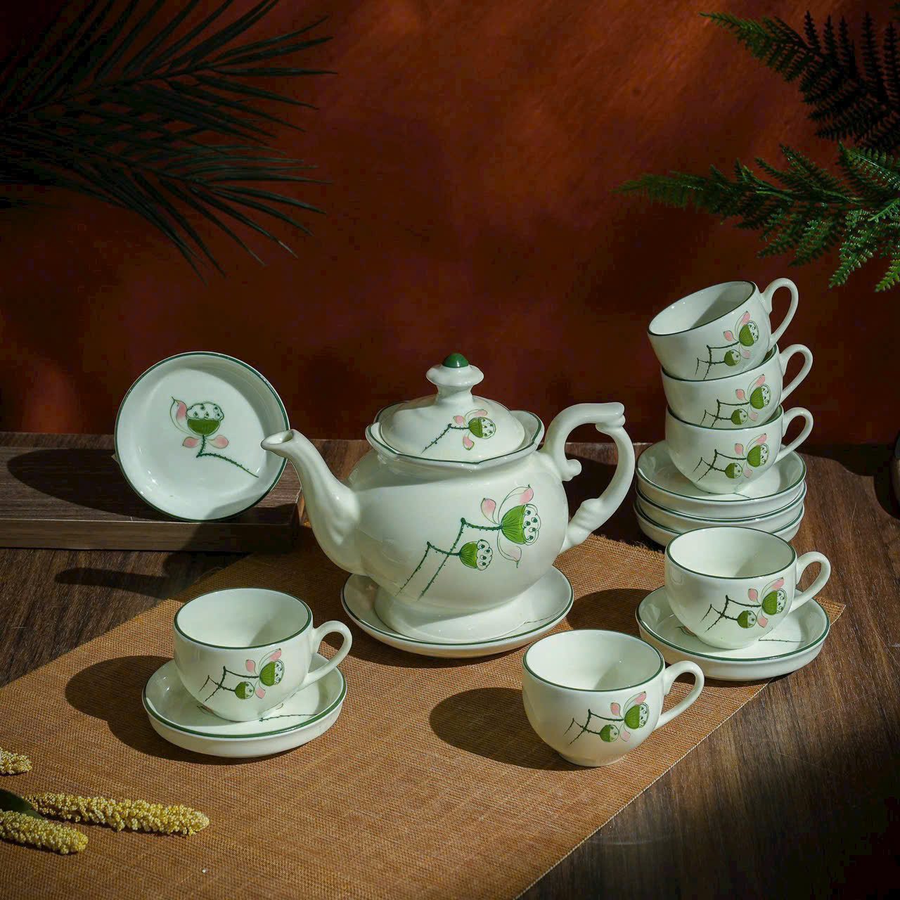 Bộ Ấm Chén Bát Tràng Men Kem Vẽ Đài Sen AC05112224