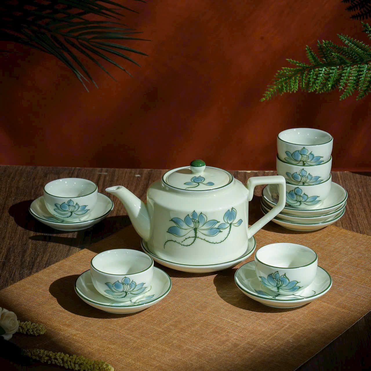 Bộ Ấm Chén Bát Tràng Men Kem Vẽ Hoa Sen Xanh AC03112224