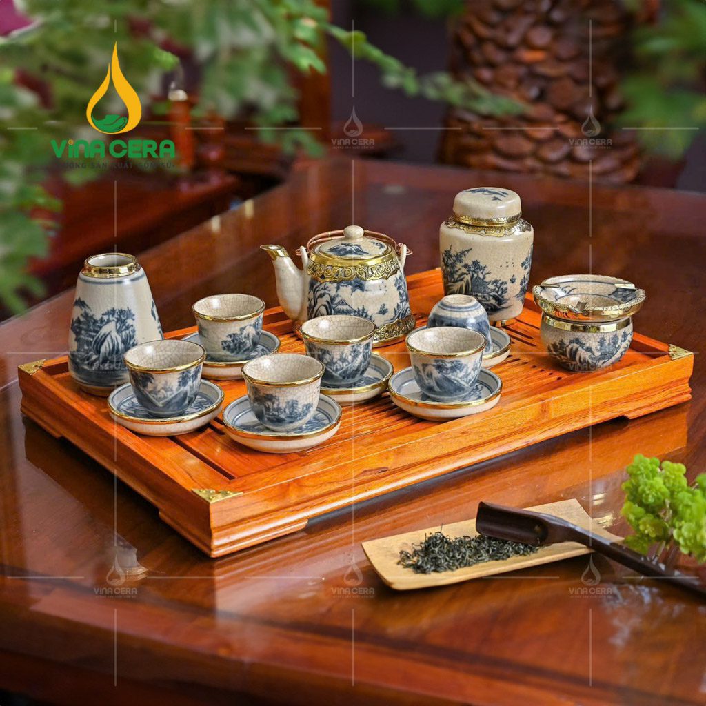 | Tên | Bộ Ấm Trà Men Rạn Dáng Chuông Vẽ Sơn Thủy | Chất liệu | Sứ Bát Tràng cao cấp |